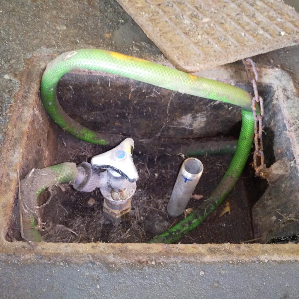 現地点検していくと室内に異常はなく、外の散水栓からシューッと音がしていました。会社の方は外に散水栓があることを知らなかったと仰せで、しばらく使用していないうちに止水栓の中のピストンが劣化したためと考えられます。配管にも異常はみられなかったので、ピストン交換を行いました。