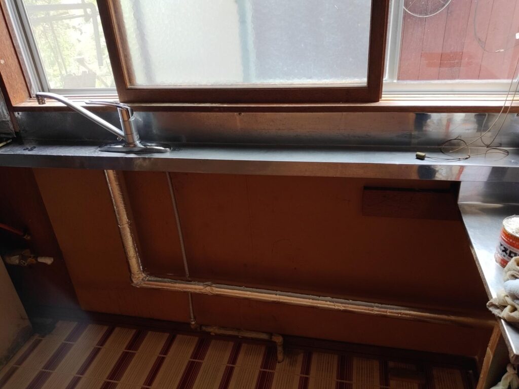 一旦台所を引き出して給湯管の引き直しを行います。人手が必要だったため、はじめにお伺いした日とは別に工事日をご調整いただきました。
