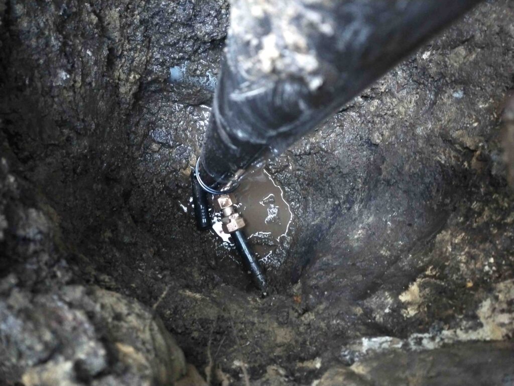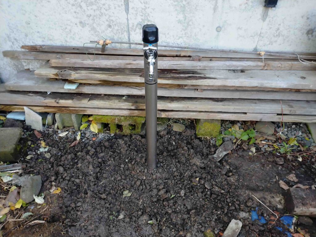 現地に伺うと、現在伸縮式で中に収納できるタイプの散水栓ですが、根元が固着しており、伸縮ができなくなっています。周りの土を掘ってみると、地中で水漏れが起きていました。散水栓本体の経年劣化が原因とみられます。今回の場合は、本体交換が必要で、お客様とご相談して自立式散水栓にお取替えしました。