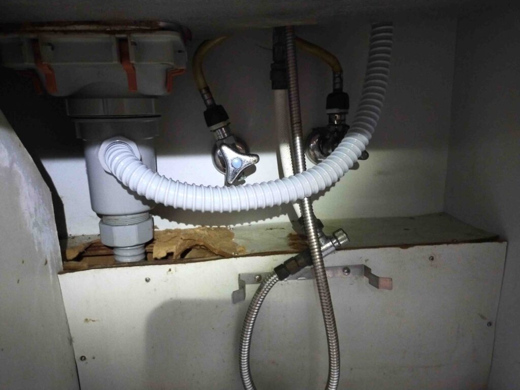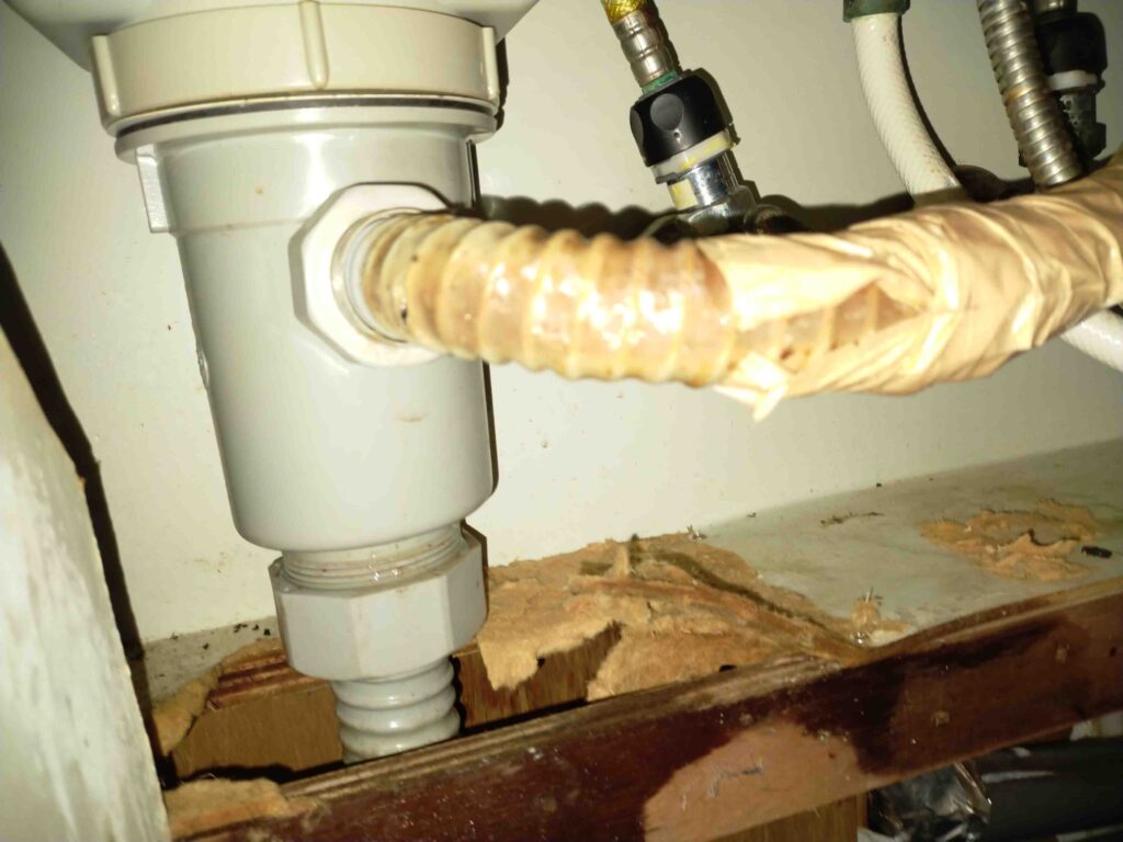 今日は、台所排水が水漏れしているとの事で作業員が伺い、点検を行いました。現地の台所下の蛇腹ホースに穴が空いており、どうやらそこから水漏れしていたようです。設備や建物が古くなると、床下から入ってきたネズミなどの害虫に、水まわりホースなどをかじられて水漏れすることがあります。お客様は見たことはないんだけどね~と仰っていました。テープを巻いて応急処置をしていたようですが、ホース本体の経年劣化もあり、今回は交換が必要とお話し。蛇腹ホースの交換をしました。