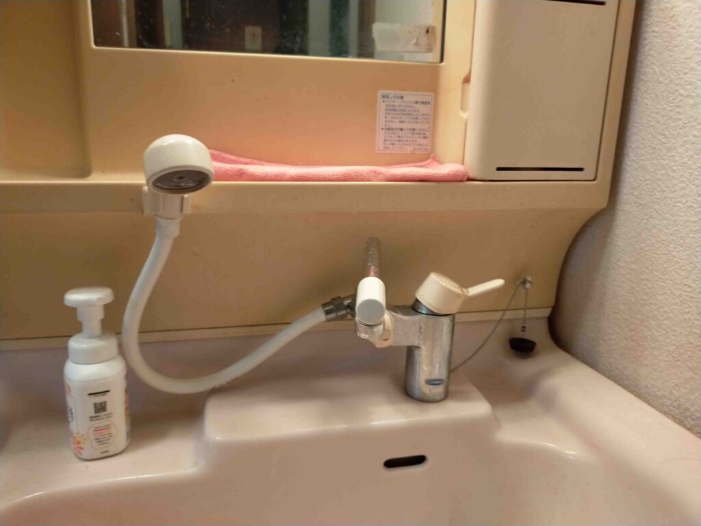 今日は洗面蛇口付近から水漏れするとお電話があり、作業員が向かいました。点検していくと、洗面蛇口の根元から物入れの下に水漏れしていて、お客様が収納物を移動しておいてくださったのでスムーズに点検が進みました。10年以上使用している蛇口で経年劣化が原因のため、本体蛇口交換が必要な旨をお伝えし、交換作業を行いました。