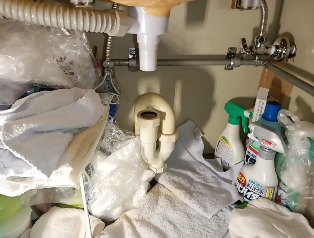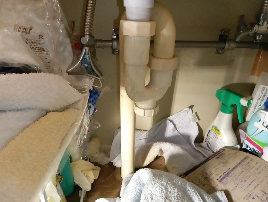 トラップ(水を一定量溜めて、下水からの悪水を防ぐ封水の役目をする部品)が外れており、装着作業をさせて頂きました!