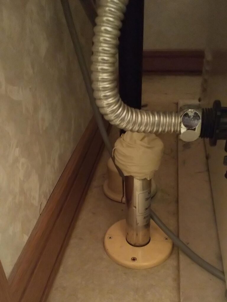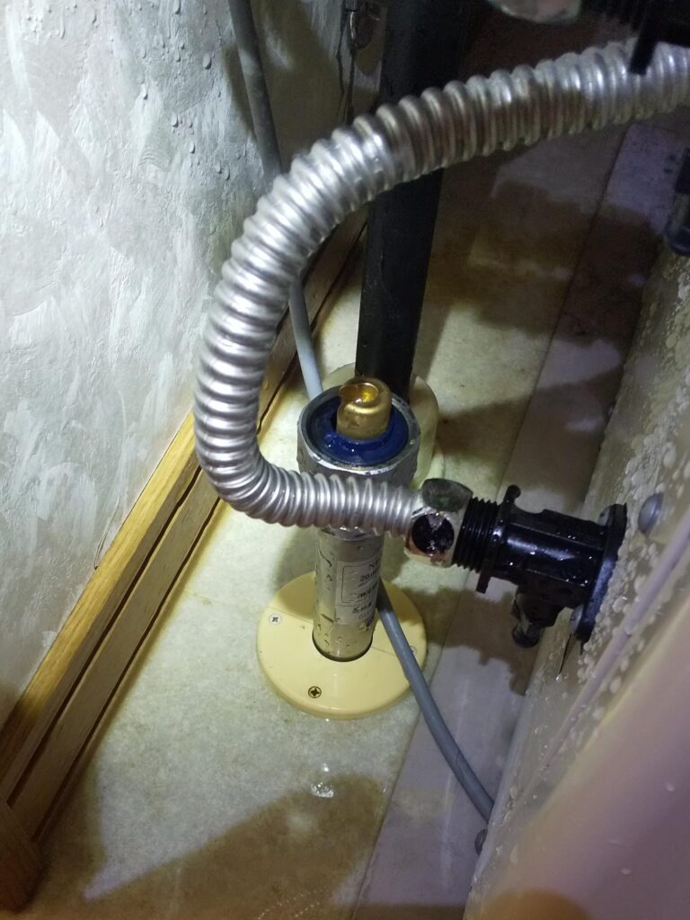 今日は水抜きをしたら、レバーハンドルが折れてしまい、水浸しで困っているとお電話があり、早めに訪問いたしました。現地は水抜栓の開閉部にレバーがついており、経年劣化が原因で折れてしまった状態でした。レバーで操作できなくなると、水が止められないので水が噴き出したままになってしまい、すぐにご連絡下さったそうです。お水が出なくなってしまうのは困るとの事で、水抜栓のレバー下をテープで巻き一時止水の対応を行いました。