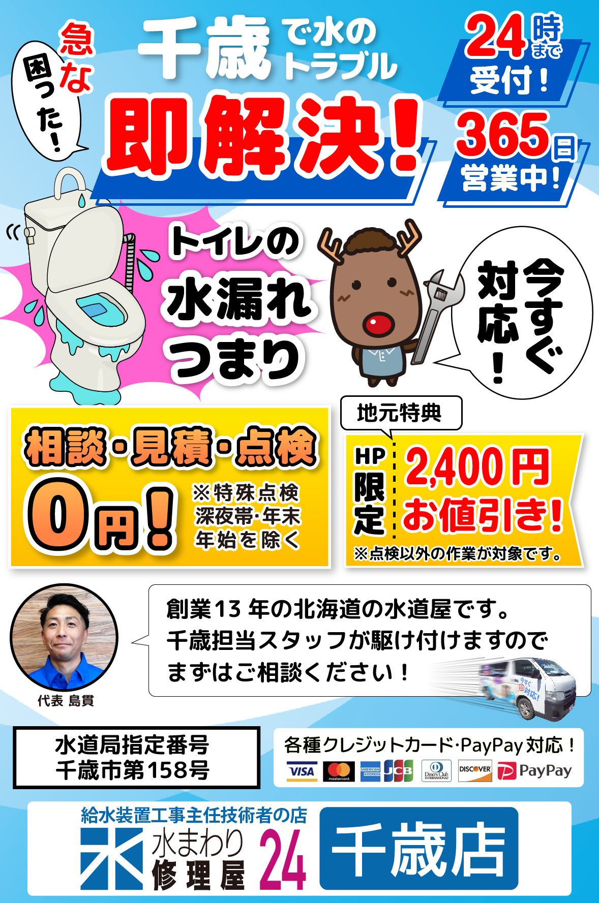 千歳でトイレつまり・水漏れ、台所・洗面台・お風呂・洗濯機の排水つまり・溢れなどは水道局指定業者の【水まわり修理屋.24 千歳店】にお任せ下さい。(千歳市水道局指定番号:第11号 ※千歳市水道局)