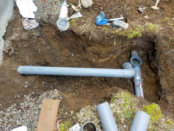 トイレだけの問題ではなくなってきましたので、急遽近い日にちである本日、排水管の工事を行いました。排水管の工事は掘ってみないと、どこでどうなっているか?分かりませんが、幸い今回は家の下に通っている排管は問題ありませんでしたので、外の一部だけでの工事で済みました。