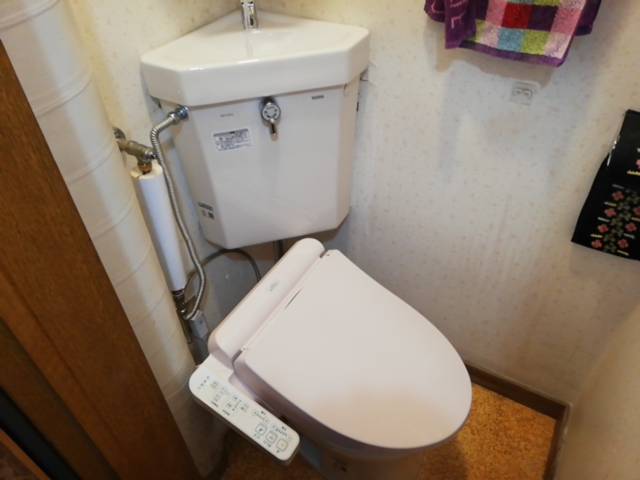 隅付きトイレ???と思う方も多いかと思います。隅付きトイレとは、私たち水道屋の専門用語でして、トイレの角に付いているタンクが三角形のトイレの事です。隅についてるから「すみつき」トイレです。