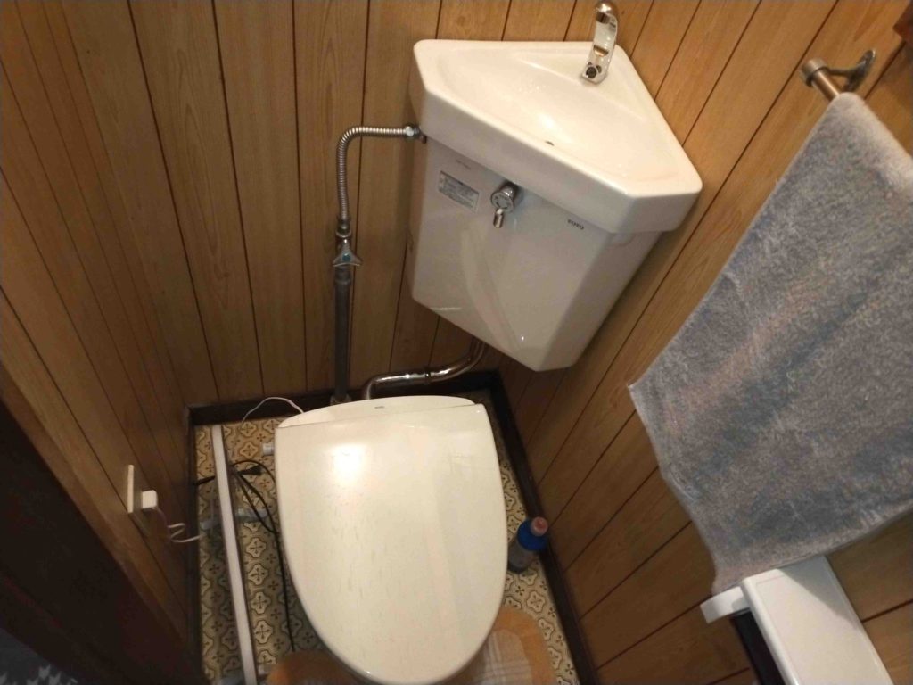 お伺いしたのは弊社スタッフのKさん。お客様宅のトイレは”隅付きトイレ”と呼ばれる、タンクが壁の隅に設置されているタイプのトイレでした。