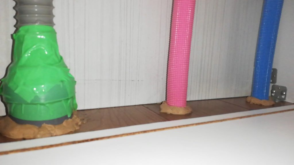 匂いの原因になるつまりを確認しましたが、今回は目立ったつまりの症状はなし。排水管が繋がっている部分に隙間があったので隙間をふさぎ、防臭キャップ周りをテープで塞ぎました。
