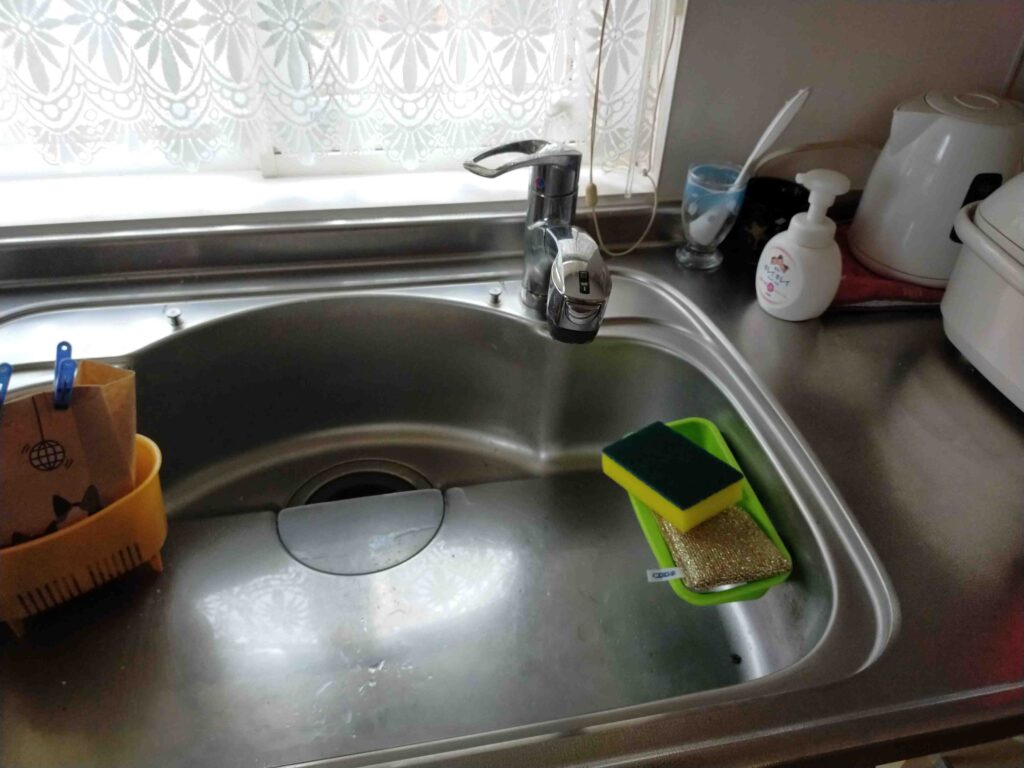 今日は台所の収納部分に水漏れしているとご連絡いただき、作業員が訪問しました。早速点検していくと、台所蛇口の根元からジワーッと水漏れを起こしていて、その水が下にも流れているような状況でした。蛇口も20年近くお使いとの事で、経年劣化による水漏れでした。