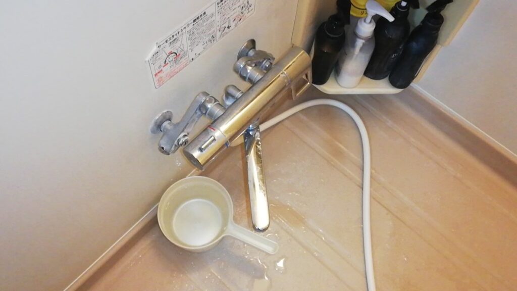『お風呂の蛇口からポタポタ水が漏れる』とお電話いただきました。点検してみると蛇口の足の部分にある水抜きネジよりポタポタと水が漏れている状態でした。お家を建ててからの25年間おそらく何もしていないという事でしたので、蛇口の寿命のため本体交換を勧めさせていただきました。