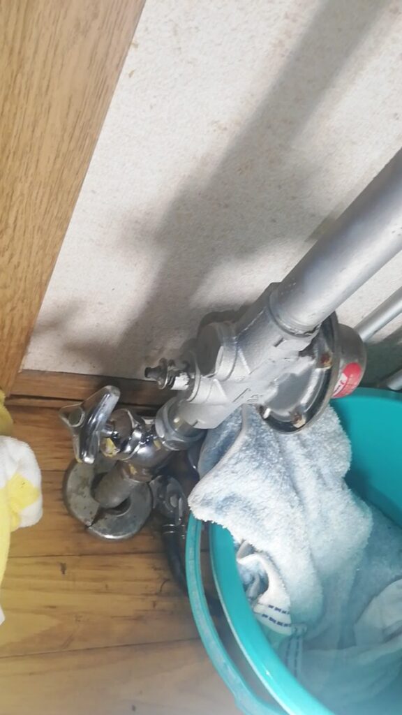 『減圧弁から水が漏れている』というご依頼です。あまりなじみのない言葉かもしれません。減圧弁とは水道の圧力を一定に調整するものです。水圧が高いと配管や給湯器の破損に繋がったり流水音も大きくなります。また、安定した温度でシャワーを使うためにも圧力が適正に保たれている必要があります。