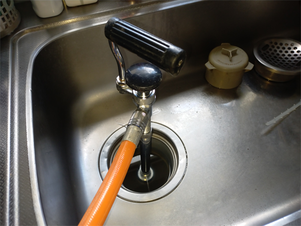 当社ではこのような一見すると台所のシンク詰まりにしか見えないトラブルでもしっかりと外の排水の状況を確認します。万が一排水管から詰まっていたら、そこから洗浄しないと意味がないですからね。