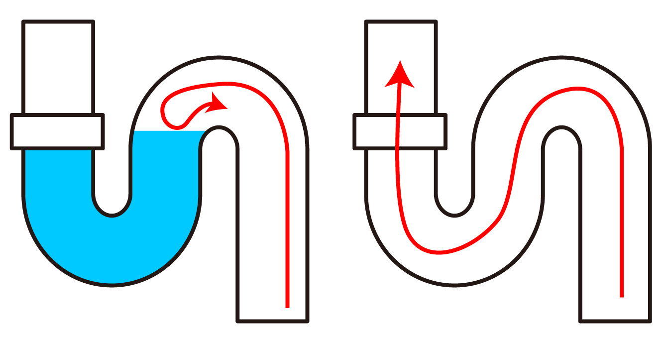 排水をみると、Sトラップと言われる部分に、本来臭いを止める役割である水が溜まっていませんでした。長く使ってないとおっしゃておりましたので、乾燥して水が無くなってしまったのでしょう。こうなると匂いは上がってきてしまいます。