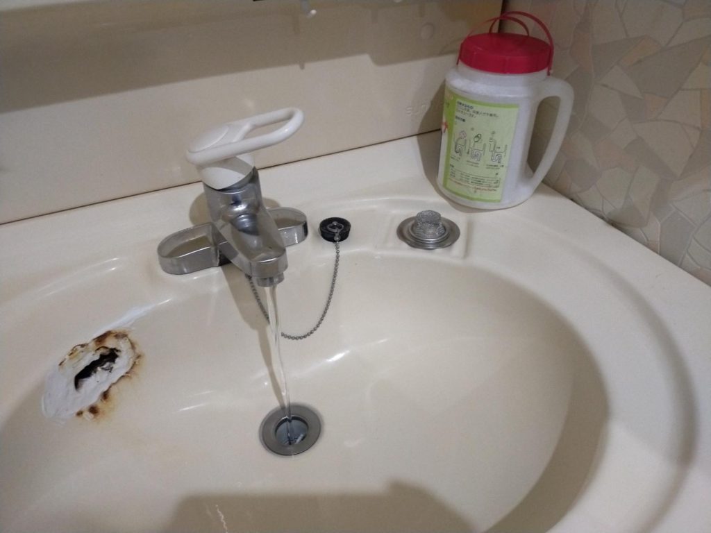 薬品にも種類がかなりあるのですが、当社が使用しているものは汚れを分解する力が非常に強いものです。人体にも有害なものですので扱いは要注意です。使用するときは窓を開けて換気しながら行うのがポイント。薬品が配管に残ってもダメなので十分に流水して、異常がないかを確認して完了させて頂きました。
