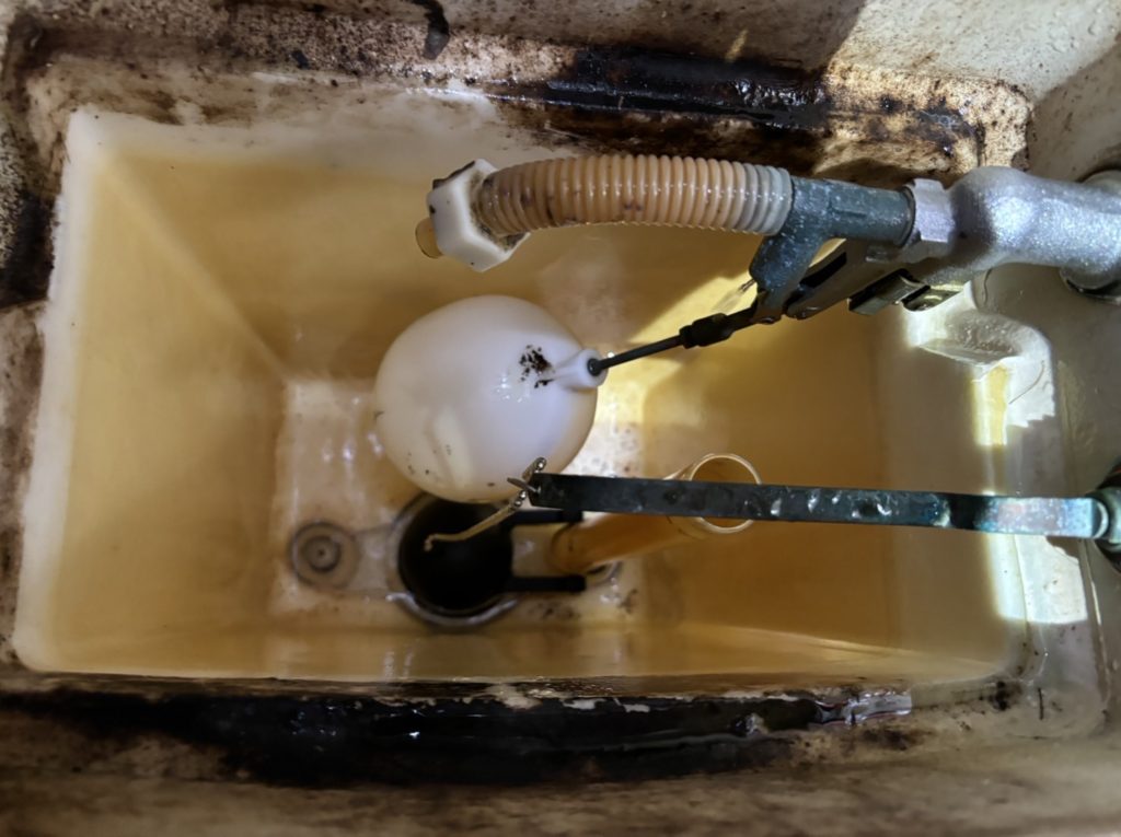 スタッフが確認した段階で、タンク内でレバーと便器内への流水口の弁になっているゴム玉を繋ぐチェーンが切れていた状態でした。ご家族がビニールテープで応急的に直していたそうです。